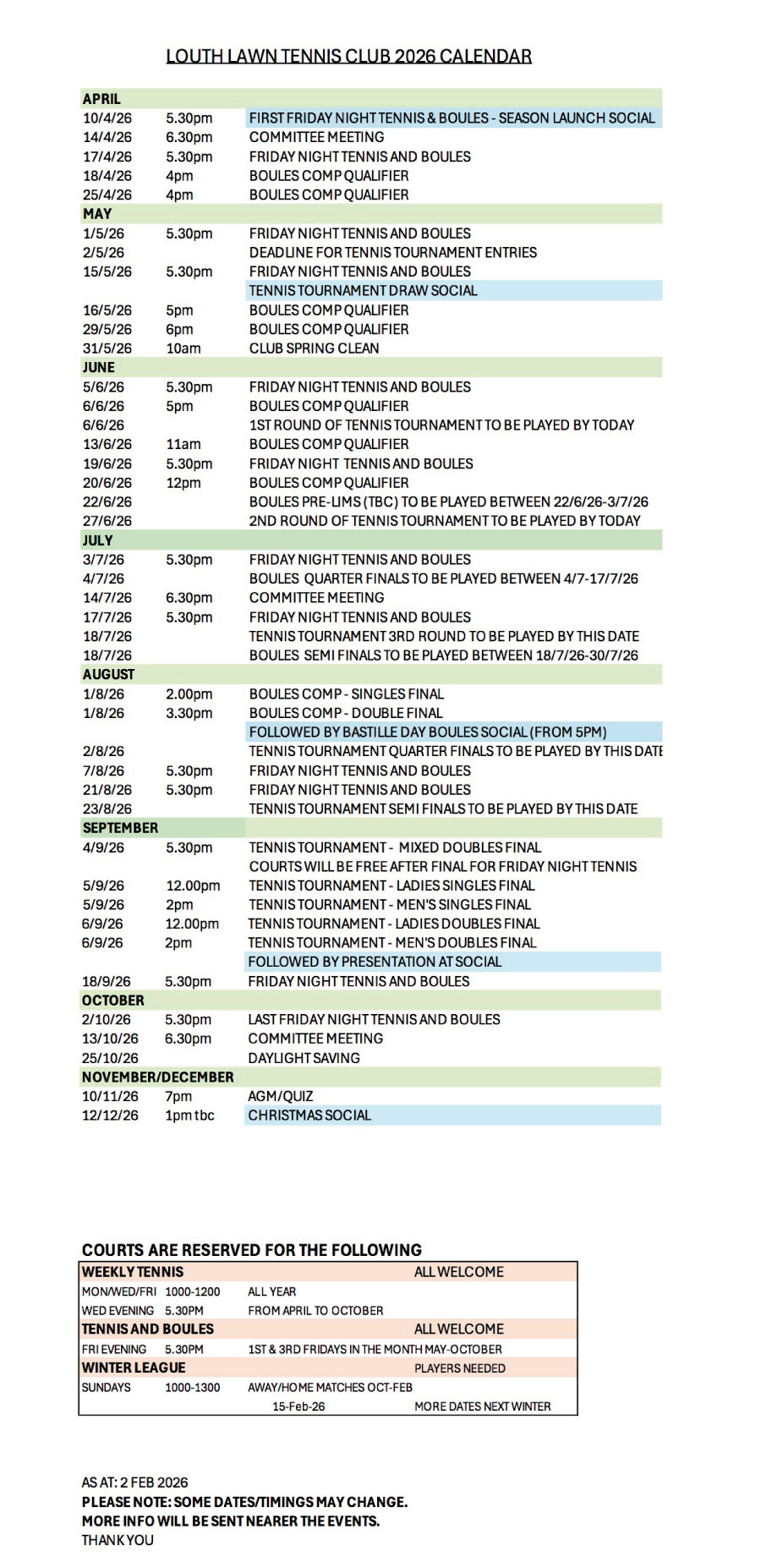 Boules tournament qualifying dates will be as follows: